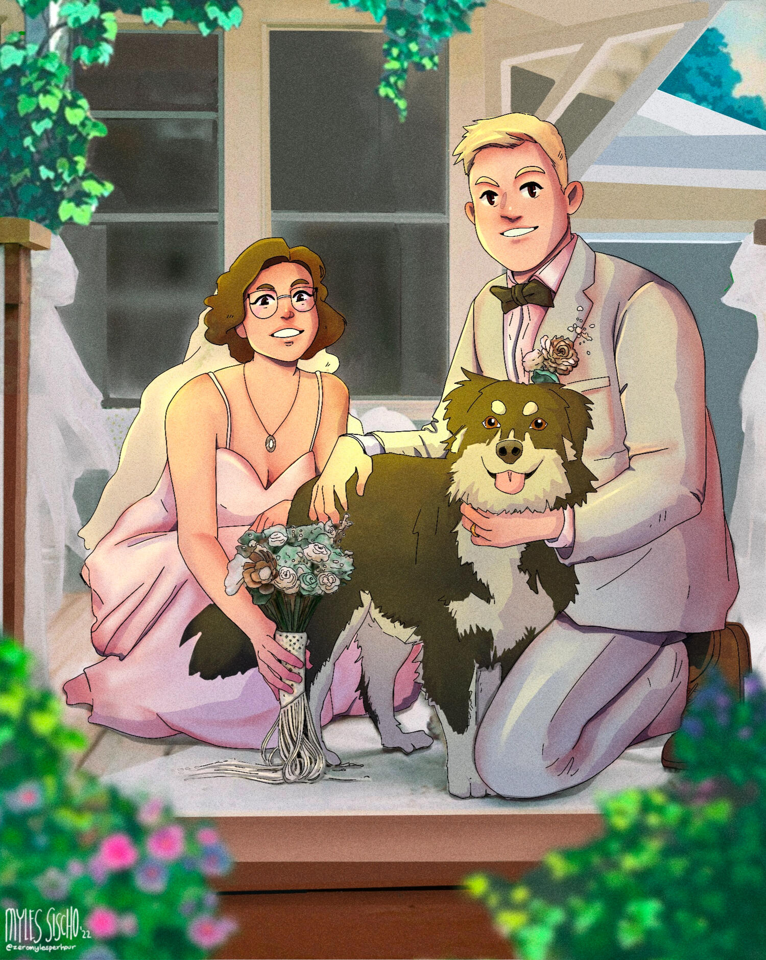 Custom portraits of friends, family, pets, characters, and whatever else you can imagine in the whimsical style of Miyazaki. Imagine yourself as a young daring hero, represent your beautiful wedding day in a different universe, reimagine yourself with a passed loved one, represent a pivotal scene from your story, or just get a unique gift for someone to show your love!Please enjoy these examples from families and creators who have worked with me in the past.
